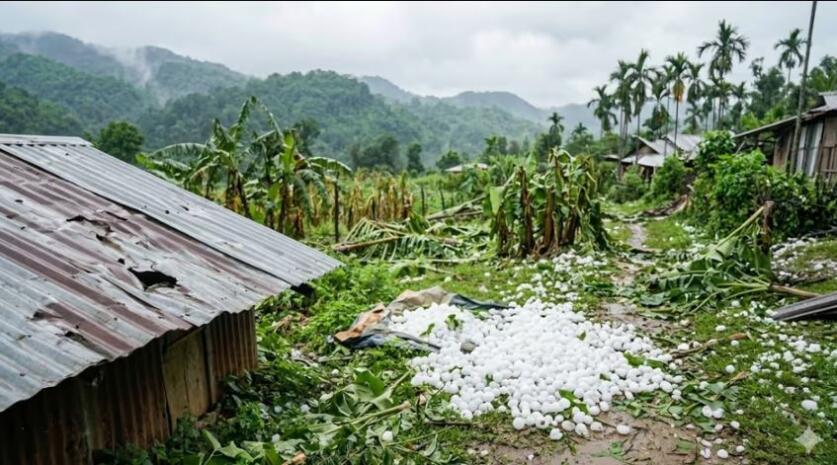 Meghalaya-ah hian Inrinni zan khan thlipui leh rial nasa takin a thawk a, rial tla hian chenna in, motor leh thlai chin tam tak a tichhia a ni. Minute 20 chhung vel rial hi tla a, ṭhenkhat chu golf ball tiatte an ni. Rangva inchung tam tak a deng pawp a, kawngsira motor park-te pawh an chhe nual bawk.