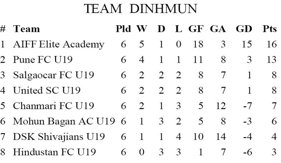 AIFF Elite Academy hian point 16 an hmu a, an hnuaia awm Pune FC U19 aiin point thumin an sang zawk. Pune FC U19 hian AIFF Academy lehpel turin Hindustan FC U19 lamah goal 13 tal an khung a ngai a, club pahnih hi nizan khan an inkhel a, result kan hre hman lo.