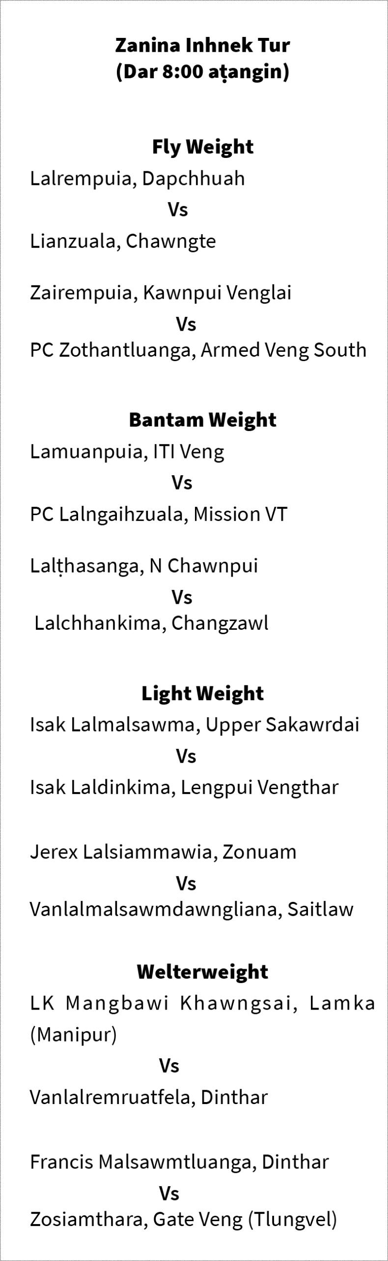 Fly champion lai NT Lalbiakkima a tel dawn lo a, welter-ah light champion lai HC Lalramfela a insawn bawk. Title humhim tur an awm loh avangin fly leh light-ah a hranpain title chuh tur zawnna final a awm dawn lo a, semifinal-a chak pahnihin champion nih an inchuh zui nghal dawn.