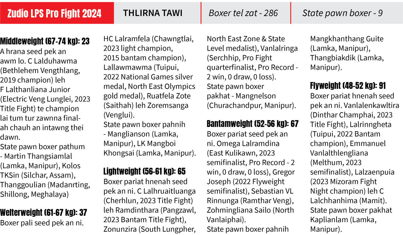 Zudio LPS Pro Fight 2024 chu zanin dar 8:00 aṭangin LPS Arena, Falkland-ah ṭan a ni dawn a, ṭan zan hian bout pariat a awm nghal ang. Inelna hi zan tinin a awm chho dawn a, boxing inkhawmpui lian hian mipui ngaihven a hlawh ang.
