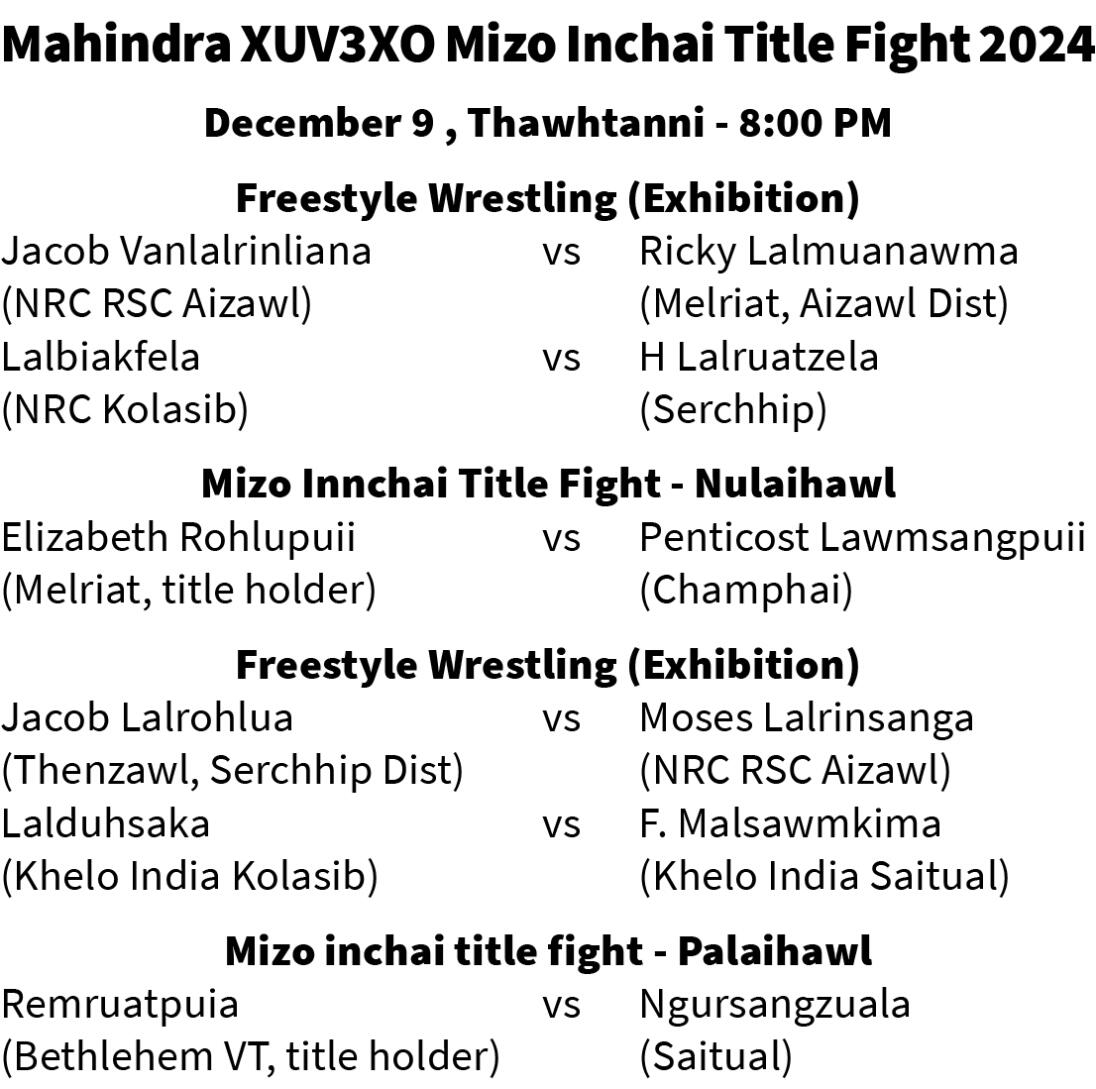 Title fight pahnih bakah hian Freestyle Wrestling (Exhibition) en tur a awm dawn bawk. Mahindra XUV3XO Mizo Inchai Title Fight 2024 hi Thawhlehni leh Nilaini zanah chhunzawm leh tur a ni ang.