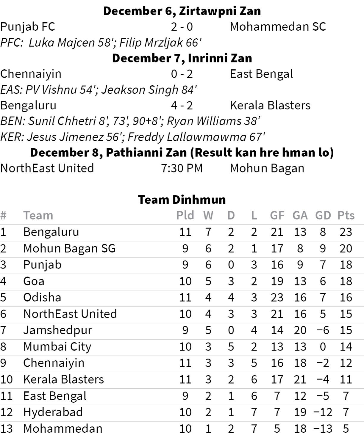 Punjab FC pawhin ISL-ah a tikimtu mai an ni lo tih an pholan chhunzawm zel a, Zirtawpni zan khan Mohammedan SC chu Luka Majcen leh Filip Mrzljak goal hmangin, 2-0 in an hneh - Mohammedan tan hian Zodingliana Tochhawng, Joe Zoherliana leh Lalremsanga Fanai ten inkhel bul an ṭan.
