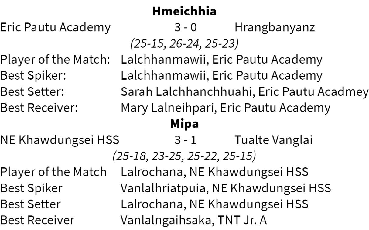 Mizoram Volleyball Assocaiton buatsaih - R&A Collection MVA U-17 Volleyball Tournament chu Inrinni khan khelh zawh a ni a, mipa inelna huangah NE Khawdungsei Higher Secondary School chuan Tualte Vanglai chu 3-1 (25-18, 23-25, 25-22, 25-15) a hnehin an champion.