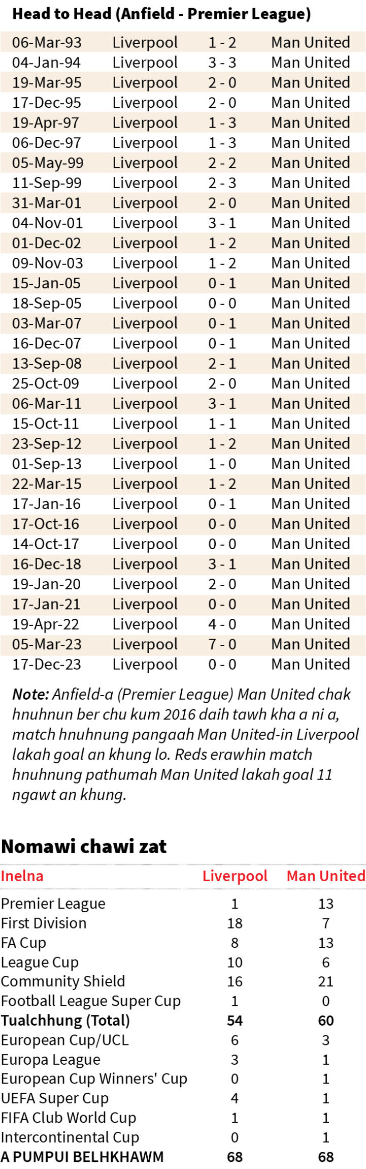 Pathianni zanah tun season-a tlarhma hlauhawm ber pawl leh midfield ṭha Liverpool an hmachhawn dawn a, an ngaihtuahawm riau. Reds tan midfield-ah Alexis Mac Allister leh Ryan Gravenberch te inkawp leh tura ngaih an ni a, United midfield-in ngam zawk tura rin a harsa!