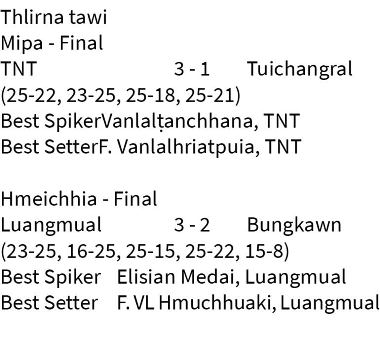 Inelna hi YMA Chanmari Hall, Lungleiah neih niin, tournament tir aṭanga a tawp thlengin TNT hi an chungnung. Best spiker atana thlan tak Vanlalṭanchhana (Valbuanga) leh a ṭhainte hian Tuichangral chu 25-22, 23-25, 25-18, 25-21 (3-1) in an hneh.