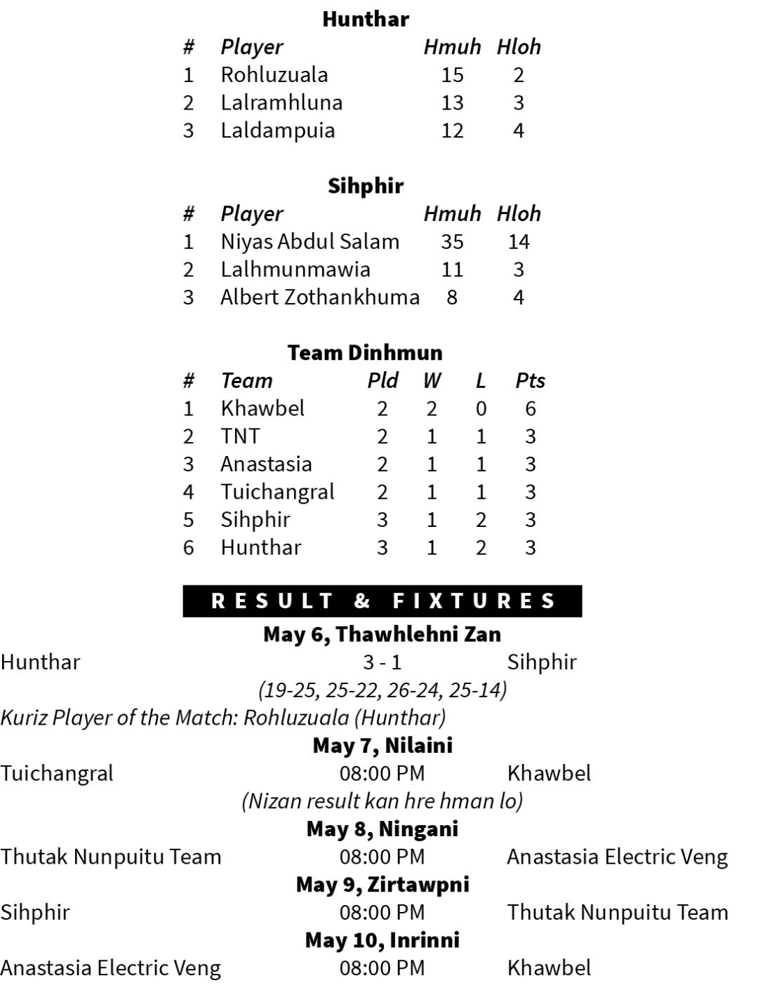 League an khelh hmasak vawi hnihah Hunthar Mizo player-te an khel ṭha tawk lo. Sihphir lakah erawh inrintawkna thar nen an khel a, Rohlua bakah Lalramhluna'n point 13 hmuin vawi thum a tisual a, Laldampuia'n ṭum 12 vaw tlain point li a paih bakah net bula lehlam vuak dangtu Lalbiakmawia Khiangte chuan point 11 hmuin point ruk a hloh a ni.