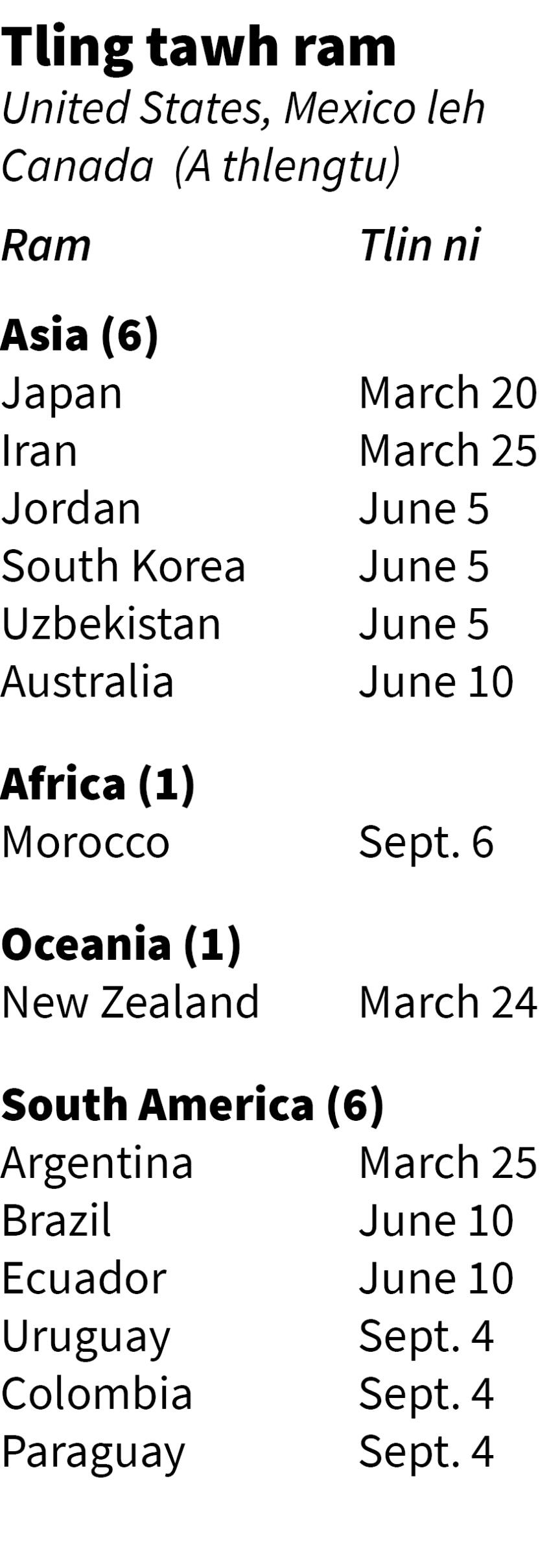 2026 FIFA World Cup chu June 11 - July 19, 2026 hian Canada, Mexico leh United States-ah te khelh a ni dawn. Khuamualpui paruk aṭangin ram 48 an inel ang.