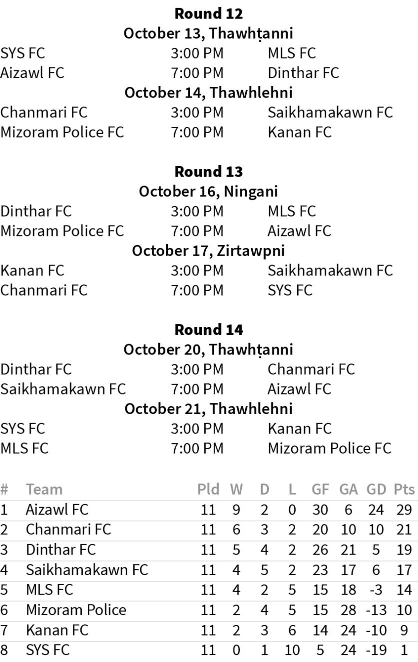 GIG Motors Mizoram Premier League Season 12-ah round thum chauh khelh tur a awm tawh a, ni kaw chhungin khelh zawh vek a ni dawn. Vawiin hian round 12 khelh ṭan a ni dawn a, round tawp ber hi October 21, Thawhlehniah khelh zawh a ni ang. Mizoram chhunga football inelna sang ber hi Zonet Rinhnim, Empai leh YouTube (member only) ah te a en theih a ni.