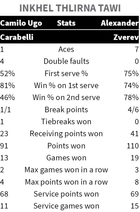 German tlangval Zverev hian theihna sang tak a nei a, a thleng sang ṭhin viau. A bik takin Masters 1000 hi a khel ṭha ṭhin, tun ṭumah pawh hian nomawi hum thei tura ngaih a ni - Arthur Cazaux hnehtu Alejandro Davidovich Fokina nen an intawng leh ang.