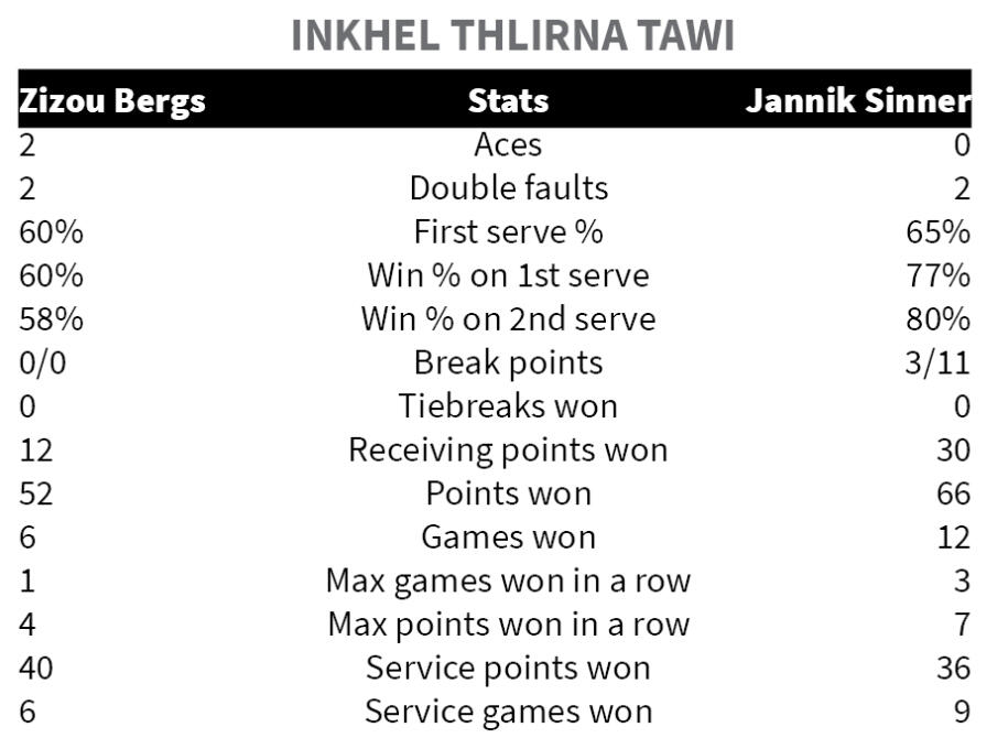 Jannik Sinner chuan world number 1 nih theihna kawng remchang a neih chu a zawh ṭan - Nilaini zan khan Zizou Bergs chu 6-4, 6-2 a hnehin Paris Masters last 16 a inhlangkai.