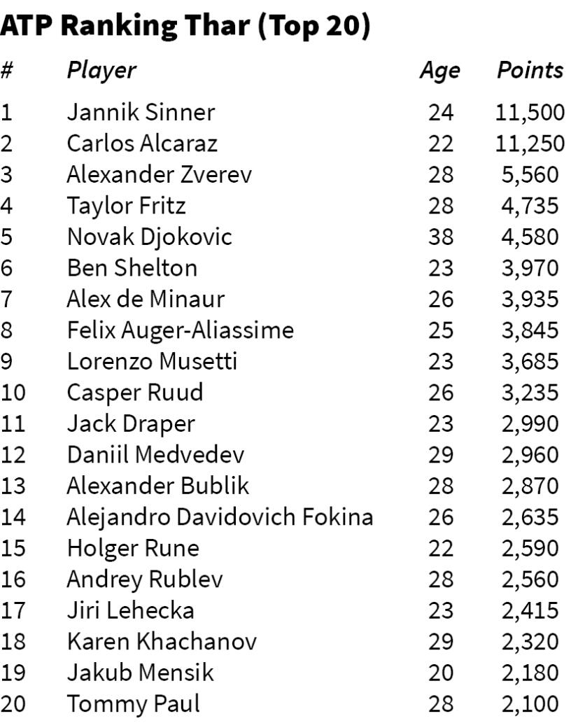 Mipa tennis ranking sang zual pariat inelna hi November 9-16 chhungin Turin, Italy-ah khelh a ni dawn. Carlos Alcaraz, Jannik Sinner, Alexander Zverev, Novak Djokovic, Ben Shelton, Taylor Fritz leh Alex de Minaur te an tling chiang tawh, hmun ruak hnawh khah tur pakhat a la awm a ni.