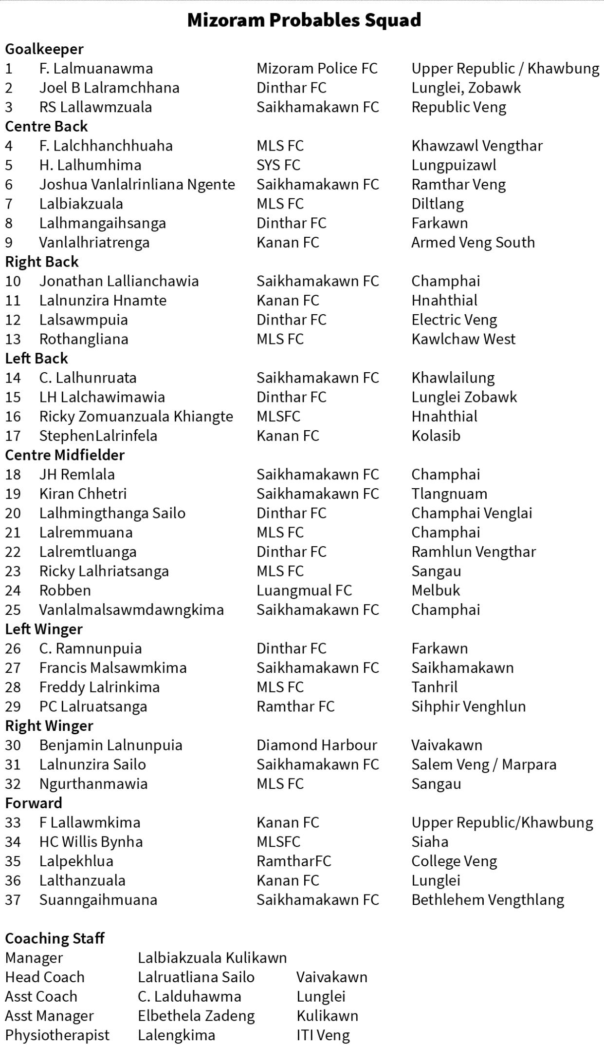 Mizoram coach tur Tawia; Probables squad-ah player 37