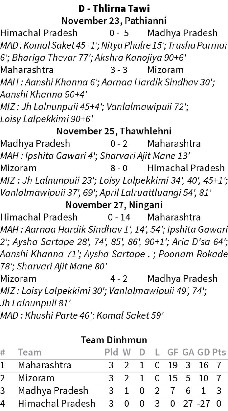 Dr. Talimeren Ao Junior Girls’ National Football Championship 2025-26-ah Mizoramin match hnuhnung berah Madhya Pradesh 4-2 in an hneh a, ṭum inelnaah chak loh nei lo mah se group stage an paltlang lo. Mizoram leh Maharashtra ten point sarih ve ve an hmu a, goal difference-ah Maharashtra dinhmun a ṭha zawk.
