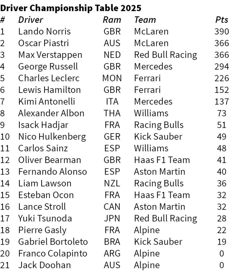 McLaren driver Norris hian a teammate Oscar Piastri leh Red Bull car khalhtu Max Verstappen te aiin point 24-in hma a hruai fal mek, champion tur chuan amah hnaihtu pahnih te aia point hniha a hmuh tam a tawk.
