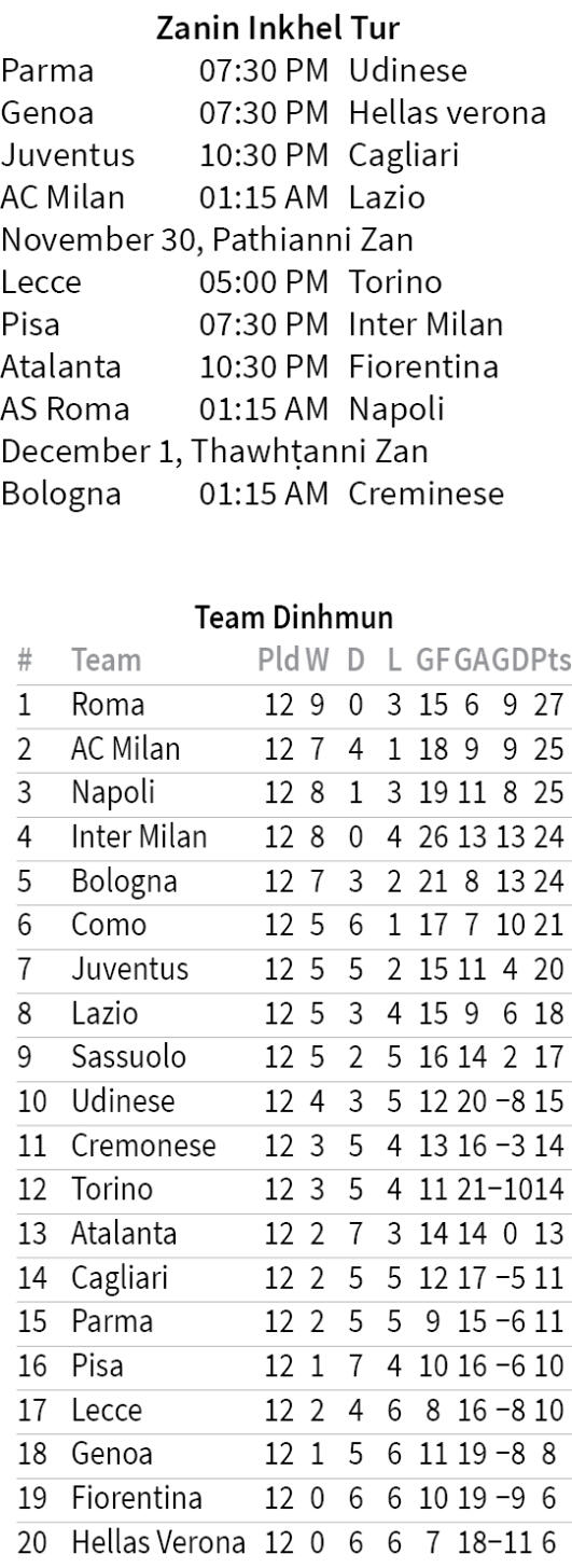 Roma hian beisei phak bakin season an hmang ṭha, league match vawi 12 an khelh tawh chinah point 27 hmuin hma an hruai mek. Antonio Conte enkawl Naples club hian point 25 an hmu thung, an inkarah point hnih chauh a awm.