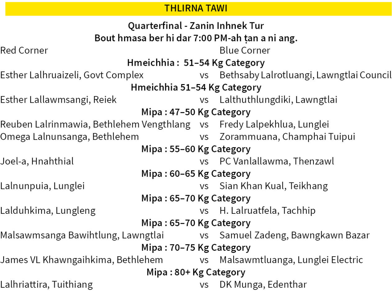 Mizoram Boxing Association (MIZBA) buatsaih Sailo Agencies - MIZBA Mega Boxing 2025 quarterfinal chu zanin hian R. Dengṭhuama Indoor Stadium, Mualpuiah khelh chhunzawm a ni dawn. Inelna hmachhawn zinga hming langsar ber zinga mi Lunglei Electric tlangval Malsawmtluanga (R. Mala) a inlan dawn a, ani bakah Tuipui tlangval Zorammuana pawh a inlan dawn. An chevel en a châkawm tawh hle.