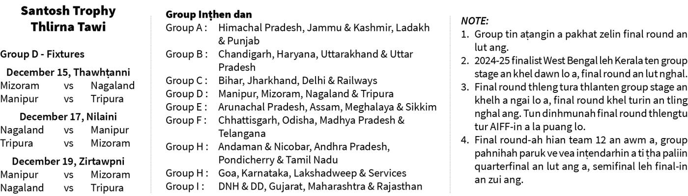 79th National Football Championship for the Santosh Trophy 2025-26 group stage khel turin Mizoramin December 12, Zirtawpni hian inelna neihna hmun Agartala, Tripura an pan ang. Mizoram hi group D-ah Manipur, Mizoram, Nagaland leh Tripura te nen an awm ho.
