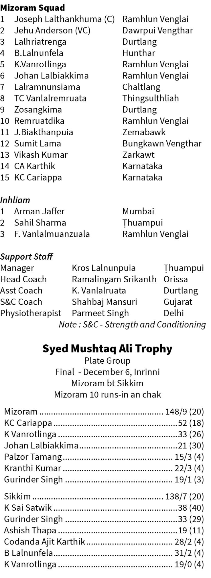 Mizoram cricket team-in mellung thar an phun a, Syed Mushtaq Ali Trophy plate group-ah an champion. Joseph Lalthankhuma captain-na hnuaia khel Mizoram hian Inrinni khan group stage-a an hneh loh Sikkim chu 10 runs-a hnehin nomawi an chawi.