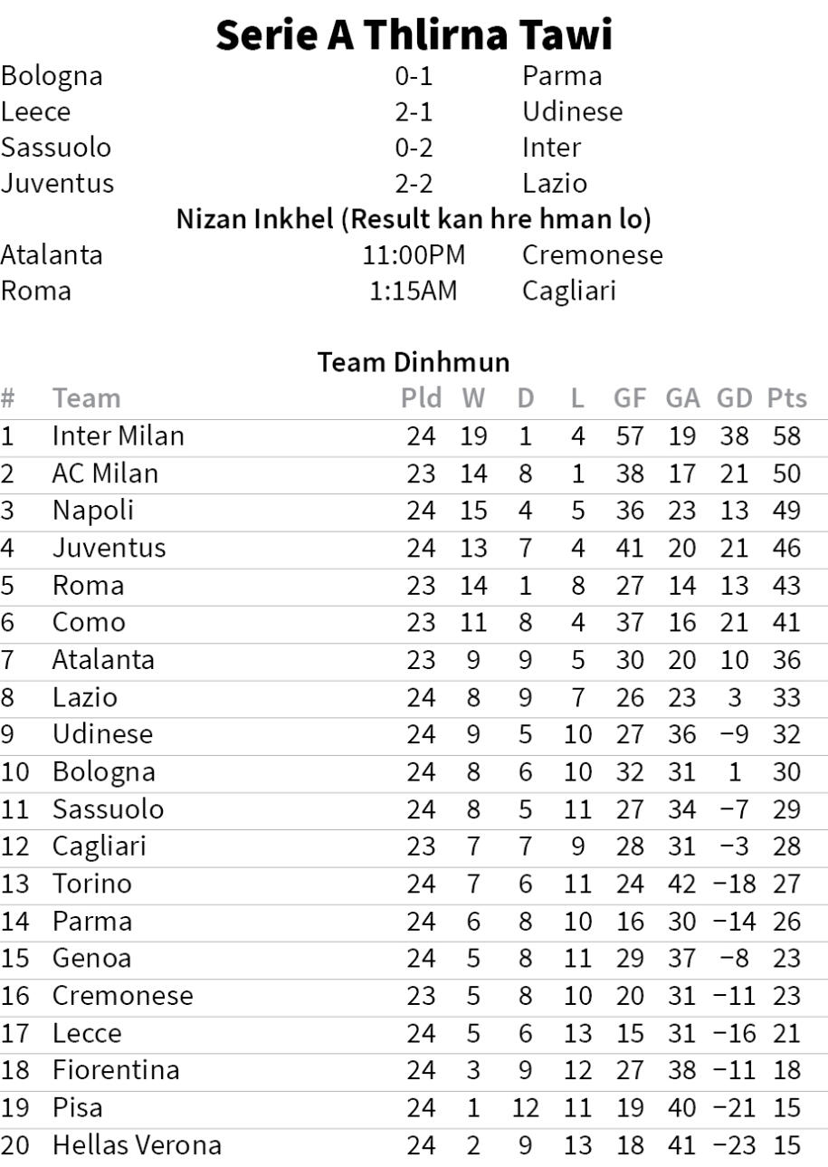 Hetihlai hian Juventus chuan an mikhual Lazio chu 2-2 in an inhnehtawkpui a, Lazio tan Pedro leh Gustav Isaksen ten goal an khung a, Turin club tan Weston McKennie leh Pierre Kalulu ten an si phurh an sut hram a, point khat an insem. Juve hian point 46 hmuin palinaah an awm.