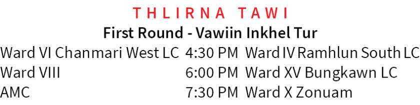 Vawiin hian Ward VI aiawh Chanmari West leh Ward IV aiawh Ramhlun South te an inkhel dawn a, Ward VIII leh Ward XV aiawh Bungkawn te an inkhel dawn. Ward XVI an tel loh avangin AMC team an inlan dawn a, zanin dar 7:30-ah Ward X aiawh Zonuam an hmachhawn ang.
