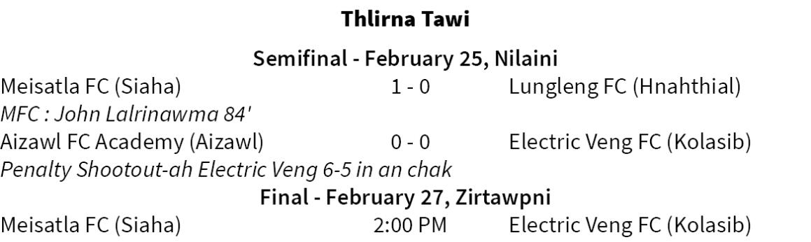 MFA Cup-ah champion lai Kolasib club Electric Vengin final an lut a, Siaha club Meisatla FC nen nomawi an inchuh ang. Inelna hi C. Ṭhuamluaia Mual, Lungleiah khelh a ni a, final hi February 27, Zirtawpni chawhnu dar 2:00-ah khelh a ni ang.