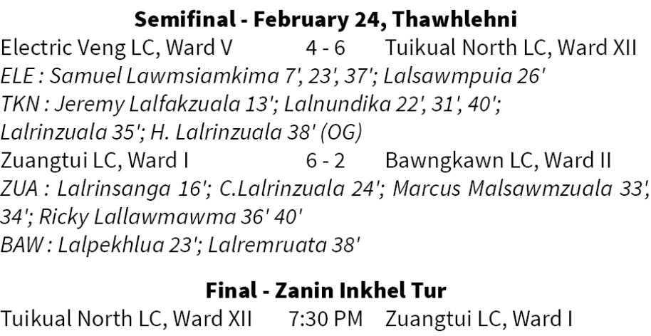Semifinal-ah Tuikual North-in champion tura rinkai zinga mi Electric Veng 6-4 in an hneh a, thilmak erawh a ni lo. Futsal-ah chuan Tuikual North hi team ṭha an ni a, India aiawh player awm tamna Electric Veng hneh thei turin an ṭha tawk.