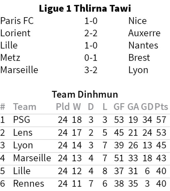 Marseille hian season tharah Champions League khelh an tum a, point 43 hmuin palinaah an awm mek a, pangana Lille nen point thumin an inthlau. Match 10 chiah khelh tur a awm tawh avangin Habib Beye naute tan chetsual chi a ni tawh lo.