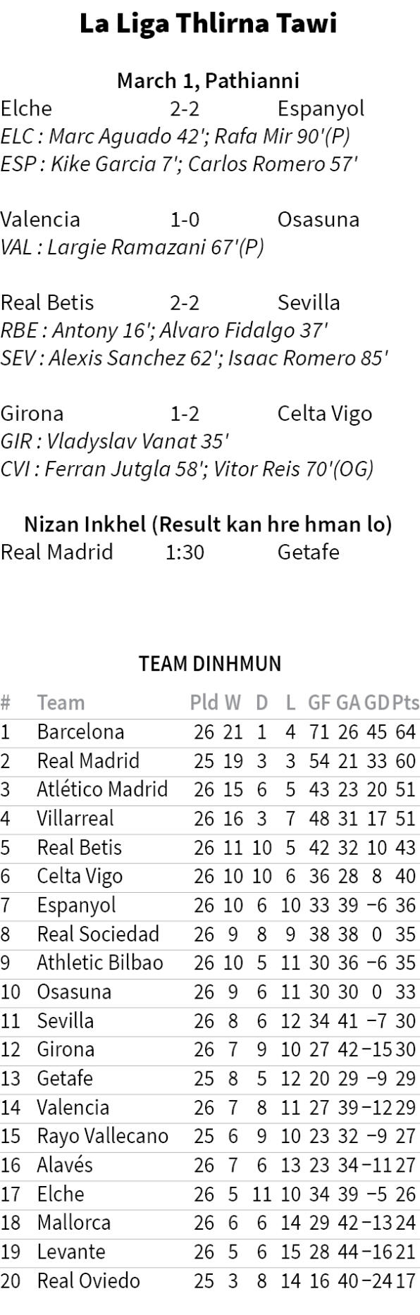 Real Betis hian point 43 hmuin panganaah an awm mek a, palinaa awm Villarreal chu point riatin an pha lo. Betis hian season tharah Champions League khelh an inbeisei a, Villarreal lehpelh an tum a nih chuan an chesual thiang tawh lo.
