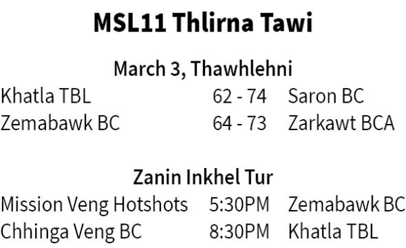 Match hmasa zawkah Saron Basketball Club-in thilmak an thlentir a, vawi thum lo champion tawh Khatla TBL 74-62 in an hneh. Inkhel hnuhnung zawkah champion lai Zarkawt BCA chuan Zemabawk Basketball Club 73-64 in an hneh bawk.
