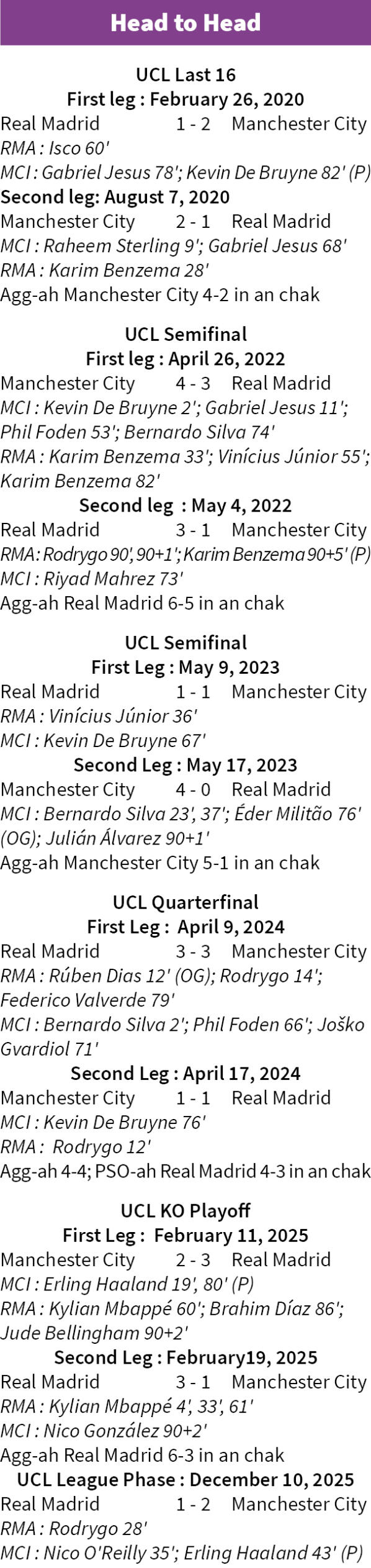 Tun hnaia khawvel club ṭha ber zinga mi Real Madrid leh Manchester City te beisei aia hmain Champions League-ah an intawng leh dawn. Zanin dar 1:30 hian Santiago Bernabeu-ah an inkhel dawn a, Champions League last 16 first leg chauh a la ni.