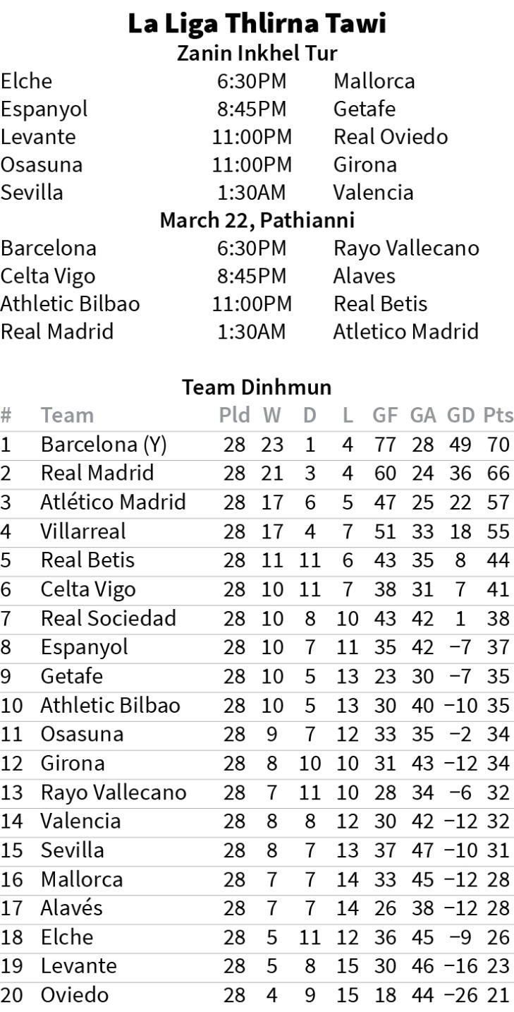 Spanish club lian pahnih Real Madrid leh Atletico Madrid te chu Pathianni zan dar 1:30-ah an inhmachhawn dawn a, Real hi champion tuma Barcelona um mek an ni a, Atletico hian Real champion-na kawng dal an duh dawn avangin inkhel hmuhnawm a beisei ngam.