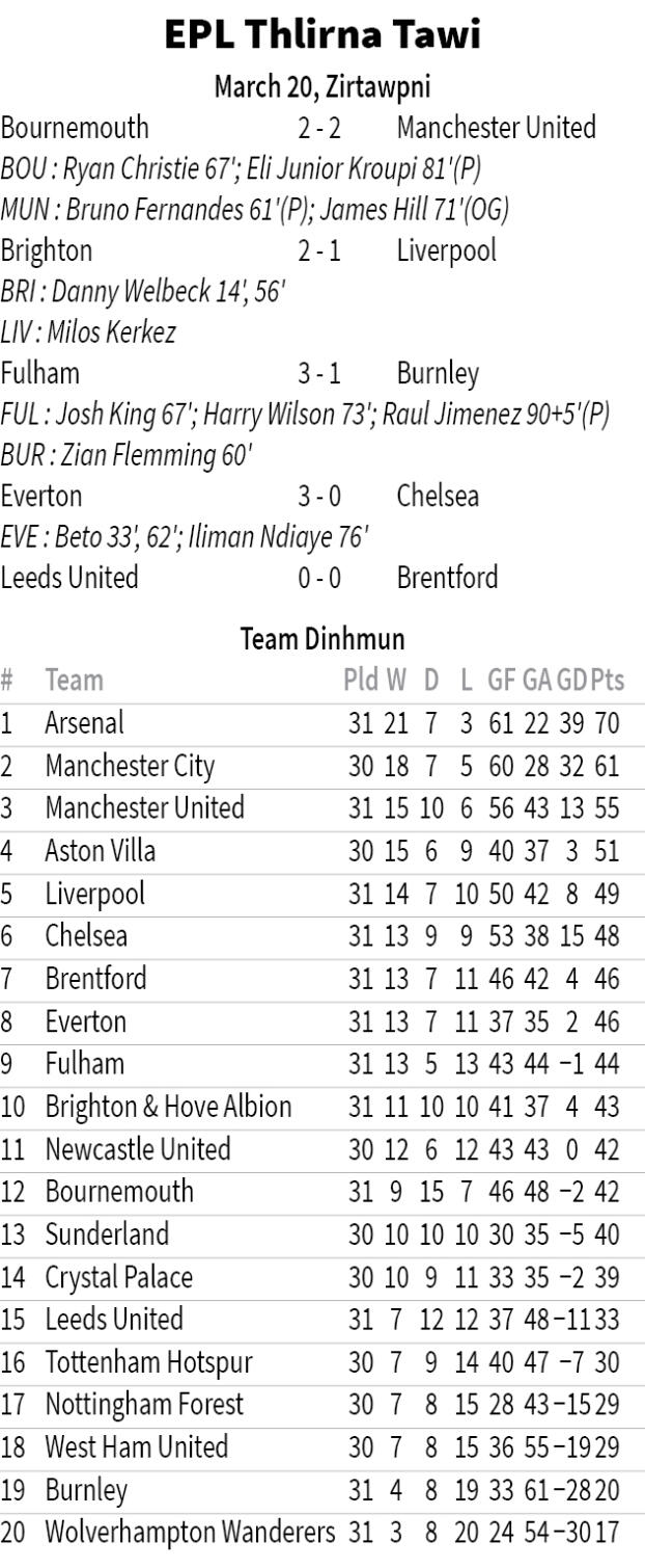 Liverpool-in Brighton an hneh lo a, Chelsea tan pangana nih theihna hun ṭha a inhawng. Mahse, Chelsea-in an hun ṭha an bawhpelh a, Everton lakah 3-0 in an mualpho. Blues hi Premier League match hnuhnung pangaah vawi khat chiah an chak a, Champions League-ah ṭum hnih ngawt PSG an hneh lo. Liam Rosenior chungah London club tan beisei san ngam a har ang.