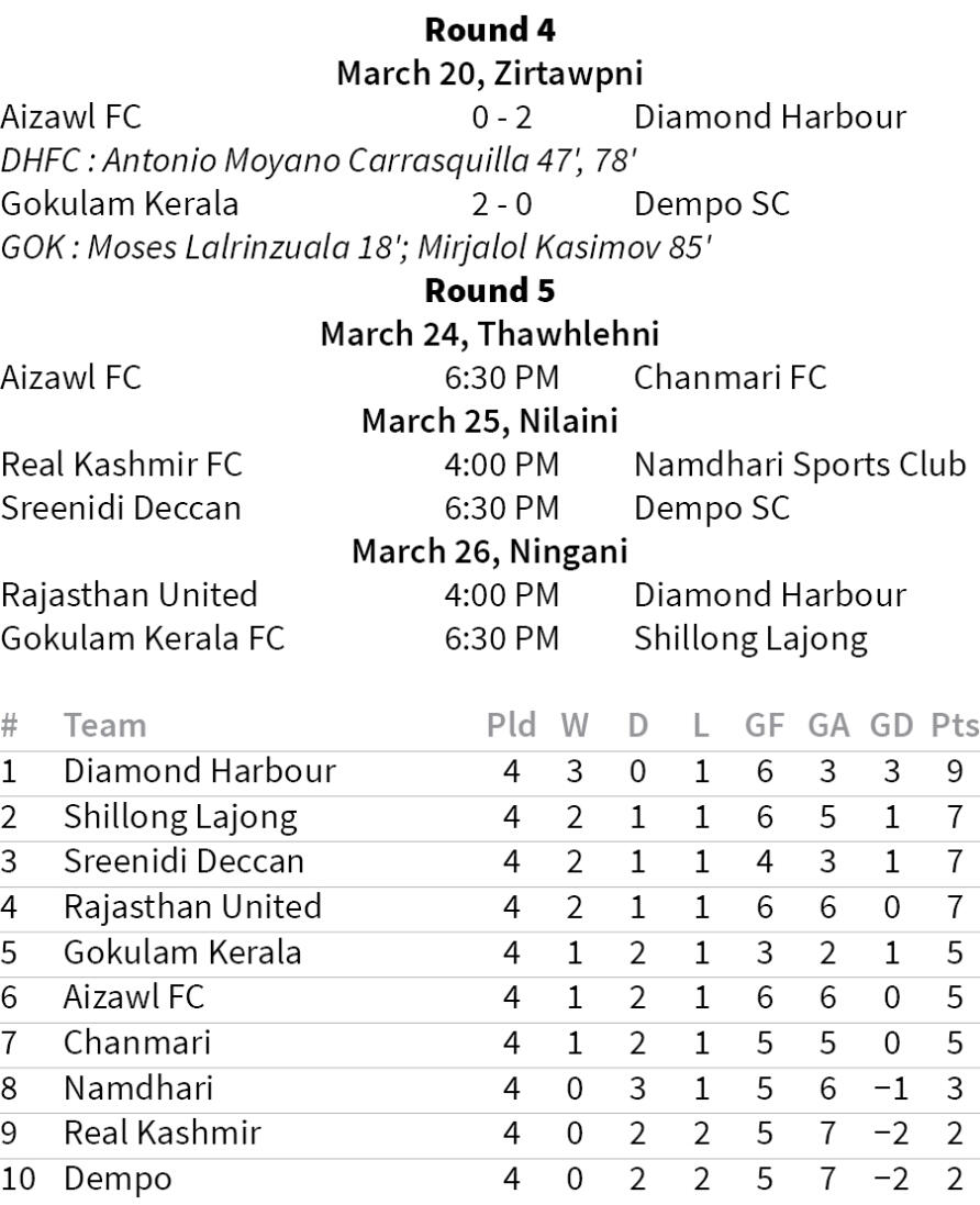 Indian Football League-ah Aizawl FC leh Chanmari FC ten bul ṭan chhe lo mah se match hnuhnung bera an chak lo ve ve avangin table chanve hnuai lamah an awm tawh. March 20, Zirtawpni zan khan Aizawl FC-in Diamond Harbour an mikhual a, 2-0 in an chak lo.