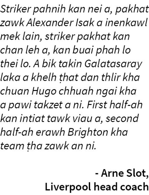 "In ṭhat lai hun a rei si lo..." tih chu Liverpool sawina ni awma mawi a ni - inkhel hmuhnawm zet pho chhuak a, Champions League-a 4-0 ngawta Galatasaray an sawp hnuah Liverpool an tlawm leh tawh a, an tlawmna chu Brighton & Hove Albion a ni.