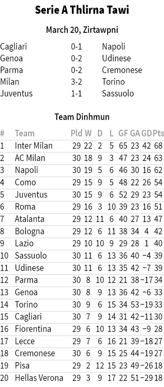 AC Milan chuan Inrinni zan khan an mualah 3-2 in Torino an hneh hram a, hnehna chang turin vanneihna an mamawh tel.