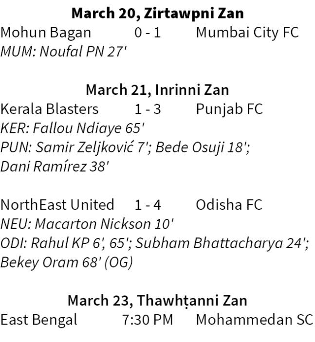 Zirtawpni zan inkhel dangah Odisha chuan 4-1 ngawtin NorthEast United an sawp - Odisha tan Rahul KP chuan goal hnih khungin, Subham Bhattacharya leh Bekey Oram (own goal) ten goal khat ve ve an khung a, tun season-a a vawi khat nan Odisha an chak.