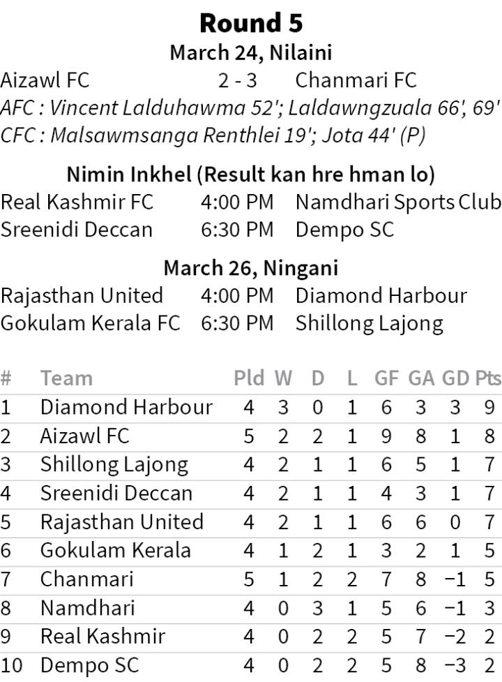 Indian Football League-ah Mizo Derby hmasa ber chu March 24, Nilaini zan khan RG Stadium-ah khelh a ni a, entu mipui 5,000 chuang pung khawm hmaah Aizawl FC leh Chanmari FC ten football hmuhnawm an pho chhuak a, R. Lalruatfela kaihhruai AFC 3-2 in an chak. Aizawl FC-in MPL12 phuba an la a, an hun tawn hlimawm dan hi thua sawifiah theih a ni lo - inkhelh bana coach R-a ṭap chuan a sawifiah chiang ber awm e.