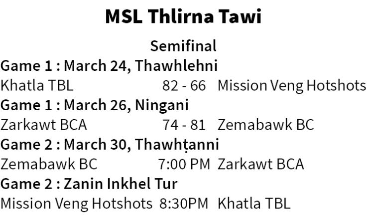 Mizoram Super League season 11 semifinal boruak a sang zel a, March 26 Ningani zan khan Zemabawk BC-in game 1-ah 81-74 in champion lai Zarkawt BCA an hneh a, rinkai loh zawk ni mah se an ke vei lamin final an rap tawh.