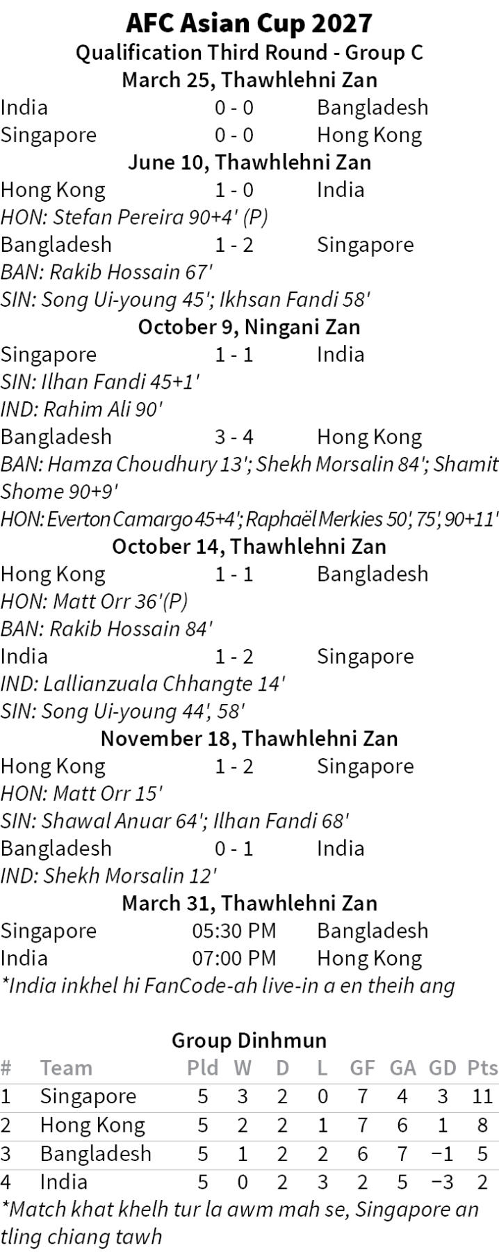 Zanin dar 7:00 hian Indian football team chuan Hong Kong an mikhual dawn - he team-ah hian Mumbai City captain Lallianzuala Chhangte, Mohun Bagan midfielder Lalengmawia Ralte (Apuia) leh East Bengal forward Edmund Lalrindika te an tel.