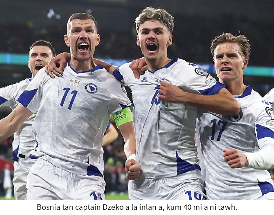 Bosnia captain Edin Dzeko pawh kum 40 mi ni tawh mah se, World Cup khelh ngei tumin a inbuatsaih a, an fimkhur tur thu a sawi thung. Dzeko chuan, "Italy laka rin kai zawk nih chu a harsa a, mahni khelmuala inkhel tur ni mah ila, rin hlawh zawk an la ni tho," a ti a, pressure lak kian a tum.