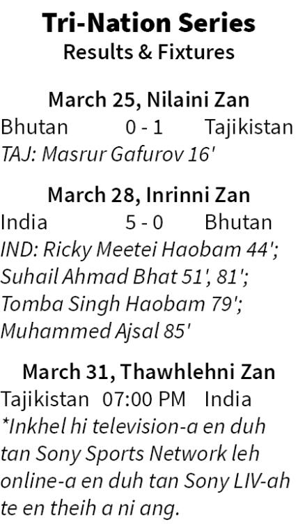 Under-23 Tri-Nation Championship 2026-ah zanin dar 7:00 hian India U23 chuan Tajikistan U23 an hmachhawn dawn a, Blue Colts tan champion nomawi chawi turin draw result ringawt pawh a tawk ang.