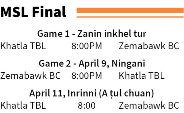 Mizoram Super League season 11 hmawr bawk a hnai zel a, zanin dar 8-ah Khatla TBL leh Zemabawk BC ten final game khatna an khel dawn. Coach H. Laldinsanga (Mapuia) enkawl TBL leh Liansangpuia enkawl Zemabawk te hian season bul ṭan ṭha lo ve ve, mahse thi leh thau pawlha an khelh hnuah final an thleng ve ve.