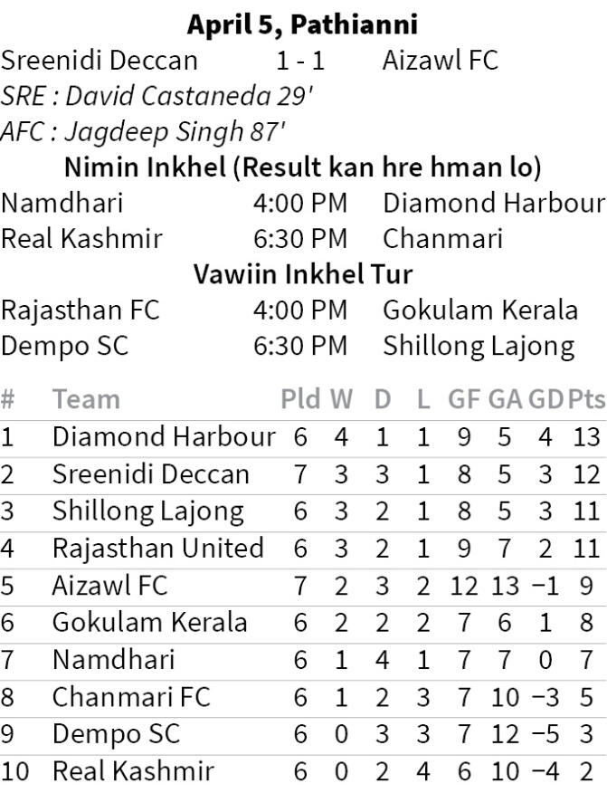 Indian Football League-ah Aizawl FC-in Pathianni zan khan Sreenidi Deccan nen 1-1 in an inhnehtawk a, point khat hlu tak an hlawh chhuak. Hyderabad club hian David Castaneda hmangin first half-ah khung hmasa mah se minute 87-naah Aizawl FC-in siphurh an sut a, Sreenidi defender Jagdeep Singh-a'n an lama a tih luh a ni.
