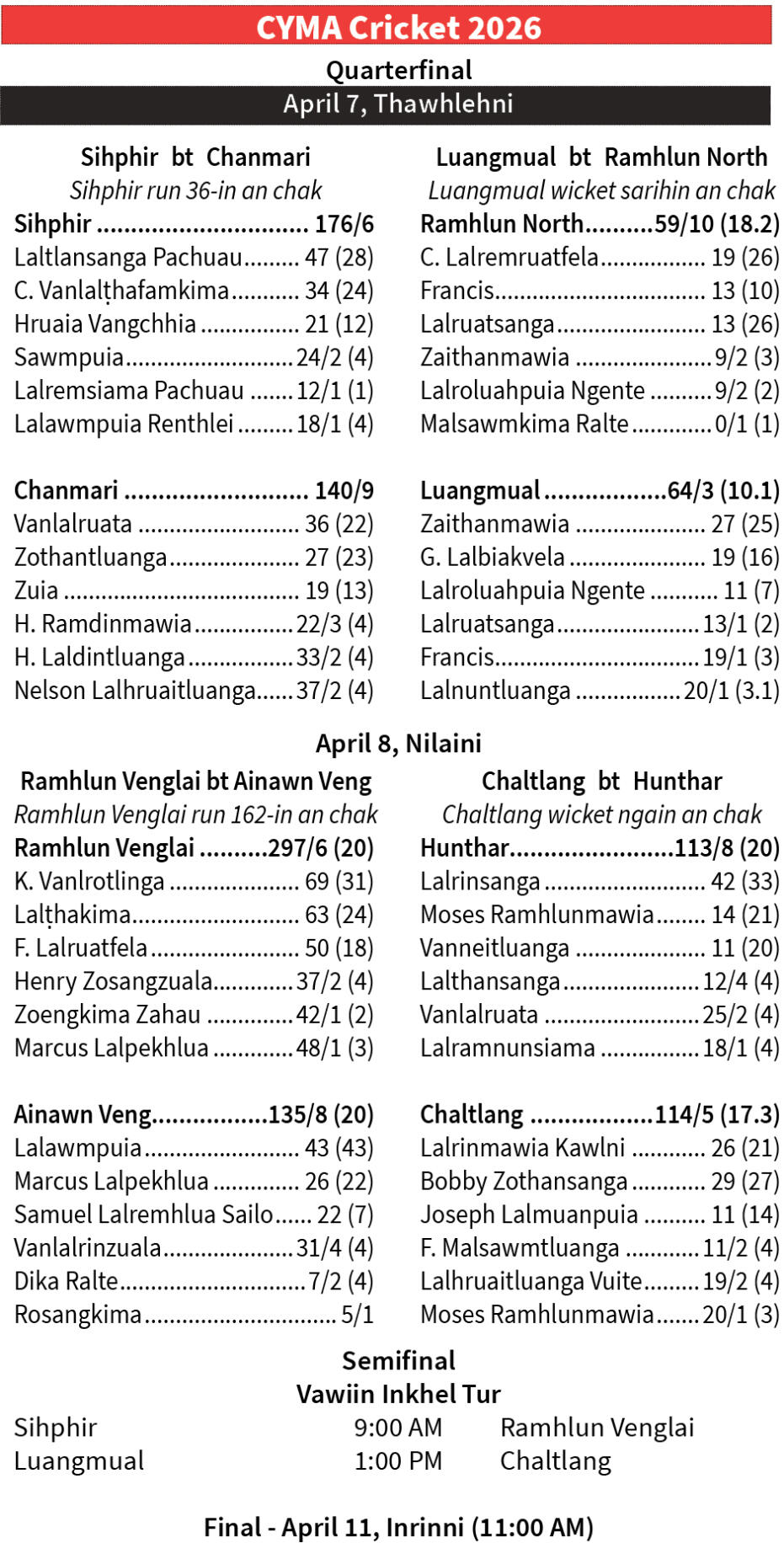Central YMA leh Cricket Association of Mizoram buatsaih 13th Inter Branch YMA Cricket Tournament 2026 semifinal chu ruahsur vangin niminah khelh zawh theih a ni lo a, vawiinah khelh ṭhat a ni ang. Chawhma dar 9:00-ah champion lai Ramhlun Venglai leh Sihphir ten a bul aṭangin an khel ṭha leh ang a, chawhnu dar 1:00-ah Luangmual leh Chaltlang te an inkhel leh ang.
