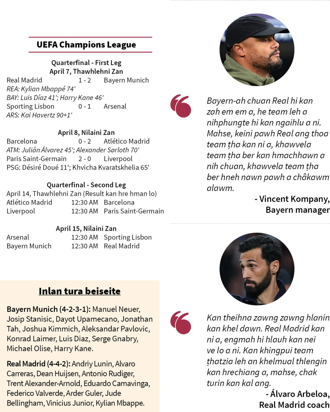 Champions League quarterfinal 'hot' bera chhal ngam chu zanin dar 12:30 hian second leg khelh a ni leh dawn ta a, Bayern Munich chuan Real Madrid an mikhual dawn.