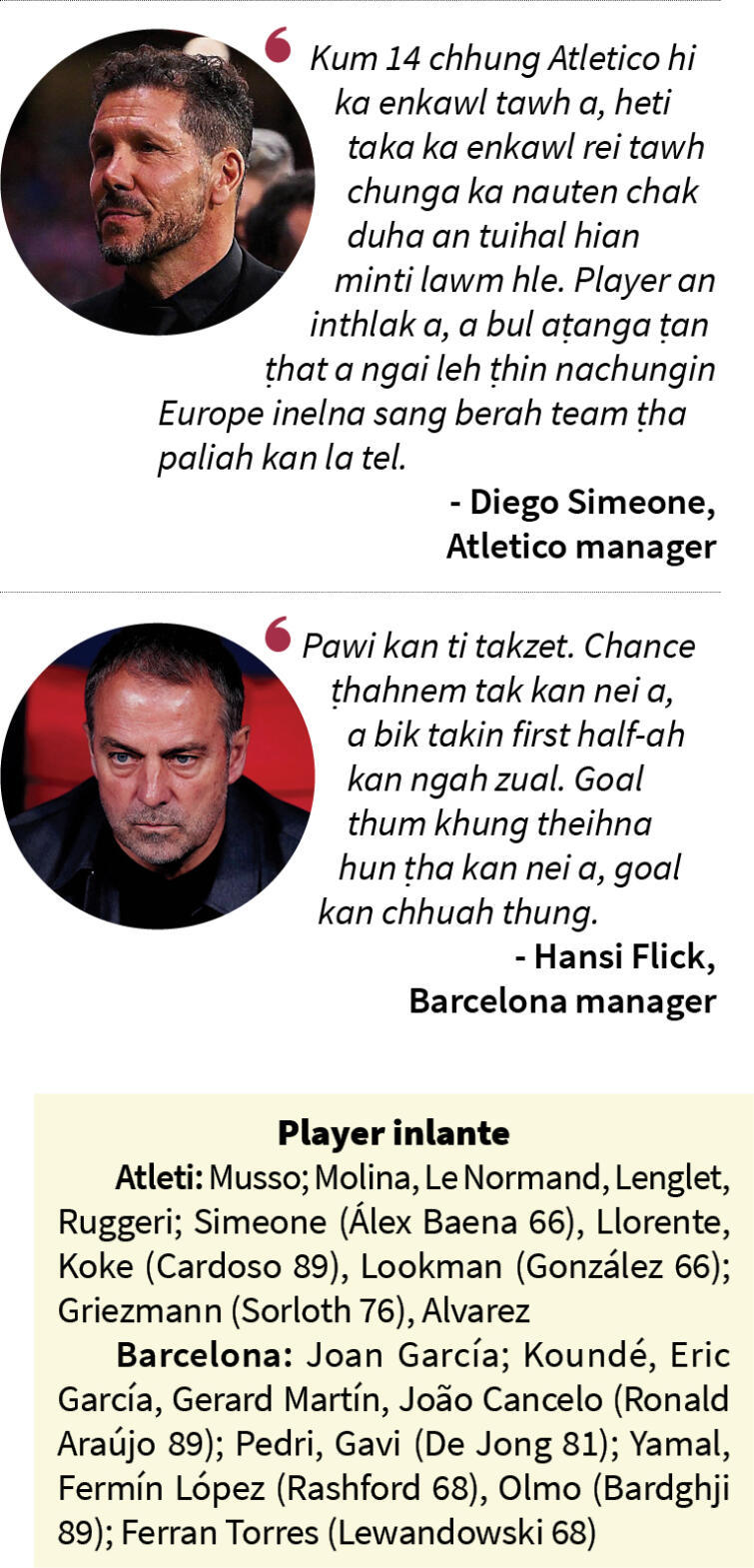 Riyadh Air Metropolitano-ah Barcelona-in mualneitu Atletico Madrid rum ṭhaih mah se Diego Simeone kaihhruai Atletico-in Ademola Lookman goal hmangin UEFA Champions League semifinal an thleng. Atletico hian nizana Arsenal leh Sporting Lisbon inkhela chak zawk nen final khel tur an zawng ang.