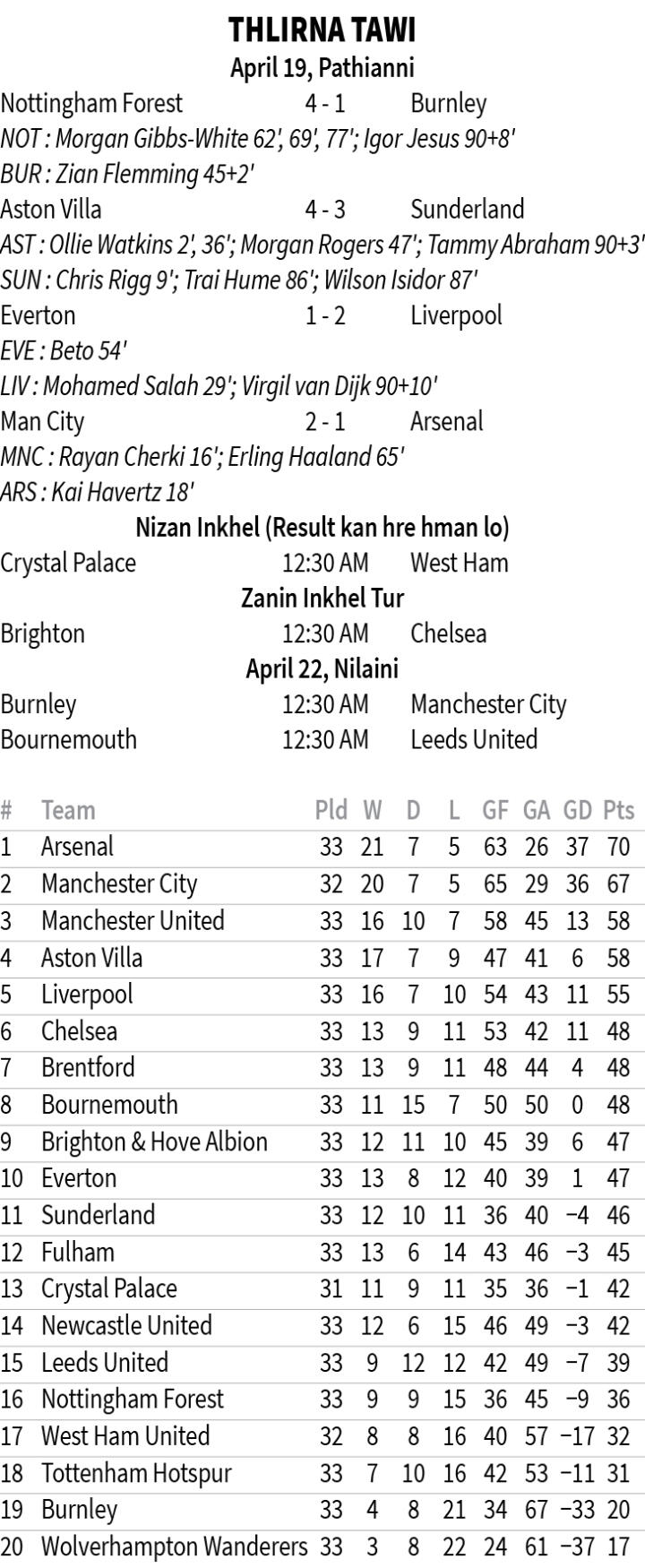 Arsenal tuarah vanpui a chim; Champion thiam Man City an rawn lang e