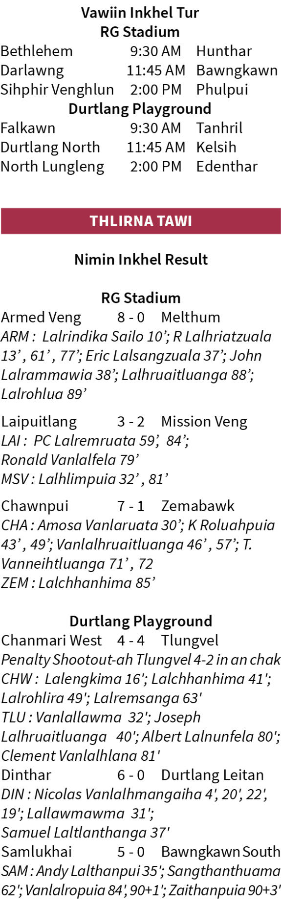 Inkhel inhnehtawk tura ngaih Chawnpui leh Zemabawk inkhelah MPL club nei ṭhin Chawnpui an chungnung a, 7-1 ngawtin an chak. Laipuitlang pawhin Mission Veng barakhaihin 3-2 in an hneh. Aizawl khaw pawn team Tlungvelin inkhel ngaina veng Chanmari West an pet tla a, Samlukhaiin Bawngkawn South 5-0 in an sawp.