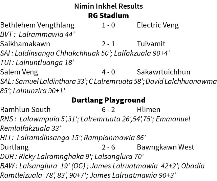 Durtlang hian an khelmual tharah Bawngkawn West an mikhual a, goal khung hmasa mah se hun a tawp meuh chuan 6-2 in an chak lo. Bawngkawn West lamin hun tawp lamah chance ṭha an bawhpelh lo a, ISL player tel lohna Durtlang erawhin football team ṭha nei leh turin insiamṭhat an mamawh thung.