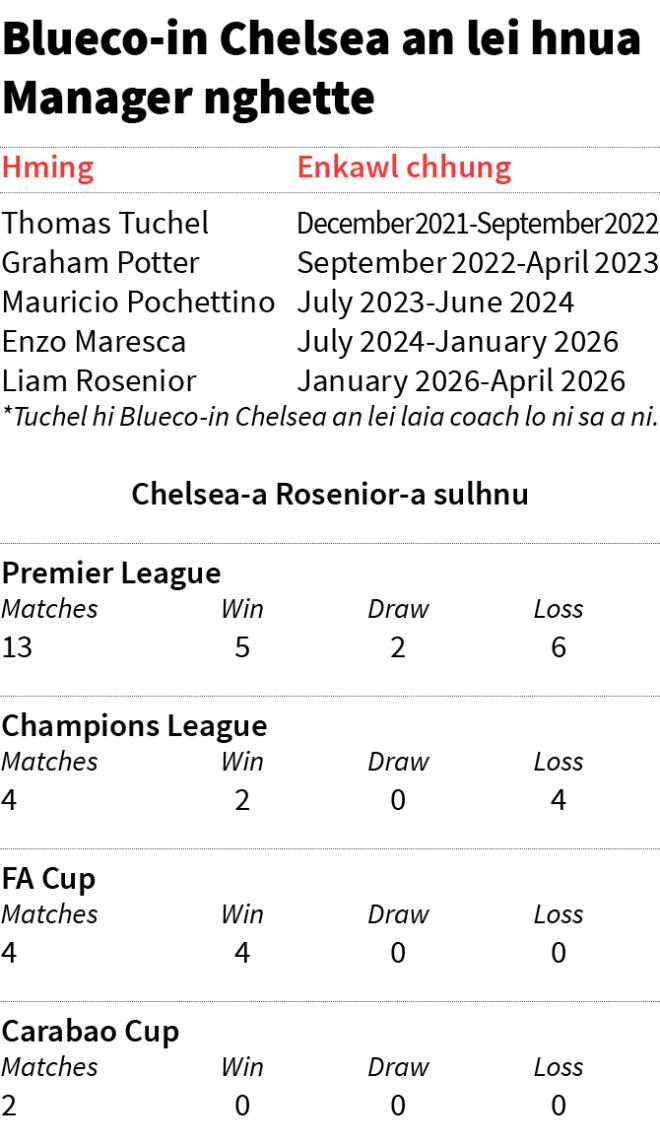 "Ka chaponaah min ngaihsak lo ula, ka hnathawhah hian ka ṭha ve tawk a ni," tiin Liam Rosenior-a'n Chelsea coach atana ruat a nih hnua a press conference hmasa berah a sawi a, mahse, thla thum a liam meuh chuan London club hian a hna aṭangin an ban fel der!
